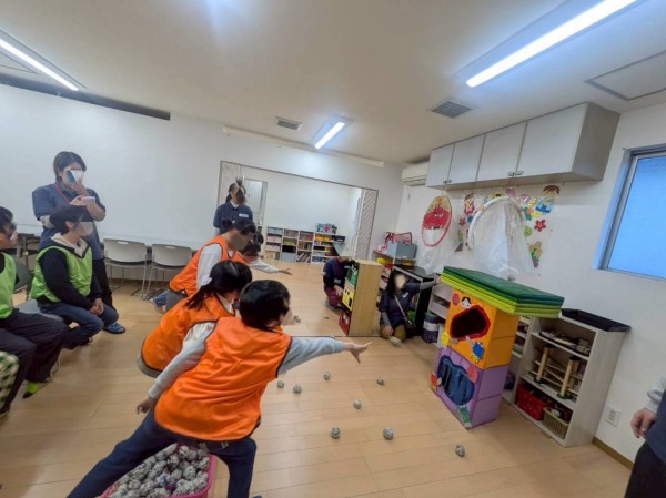 節分には2チームに分かれて、鬼の的に丸めた新聞紙を投げて、点数を競うゲームをし